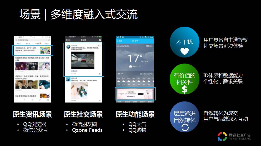 腾讯现在的广告位以移动原生广告位为主,包括QQ浏览器广告、微信公众号广告,还有原生的社交场景——朋友圈和QQ Feed广告,以及原生的社交场景广告。大家去看QQ天气就可以看到针对PM2.5和降温程度投放的专门功能性场景广告。这些都是日常可以看到的。就是我们第二个要说的场景。
