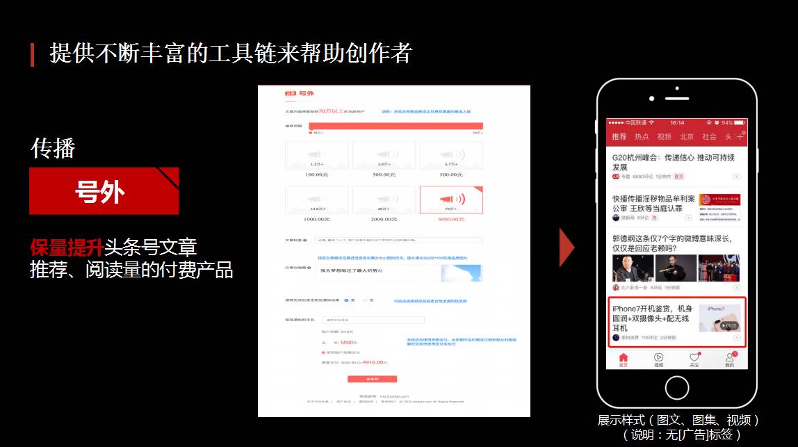 当然大家不用担心说头条开始要想办法收钱了,在推荐上会被削弱,事实并不是这样一个逻辑。我们想得非常清楚,我们的推荐就是以内容和用户的连接为主要使命,以用户的需求为主要使命。我们获取用户的时间,通过用户的时间变现,我们不需要对好的内容非要降权打压,让他们去付费推广自己,这不是我们的目的。我们只是提供一个出口,当你的内容没办法获得好的阅读量的时候,你仍然可以有低门槛的方式达成目标。