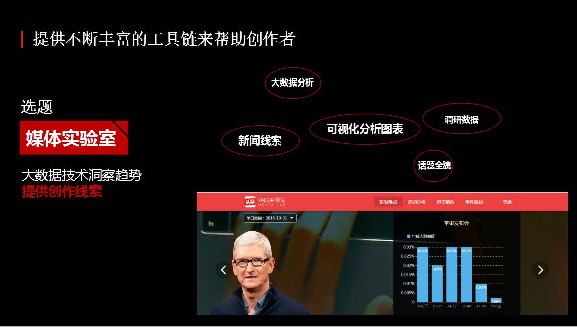 我们知道一个好的内容诞生过程大致分为三个环节,选题、创作和传播,在这三个环节里我们做了非常多的工具,通过技术手段来帮助创作者,比如在选题这块正在邀请一些作者内测我们的一个叫媒体实验室的工具。