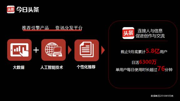 在个性化推荐和创作平台这两个方面,今日头条可以说走在了前面,上午江总讲时间窗口的事情,技术型公司的时间窗口可能会长一些,我们觉得可能在18个月左右。我们在这18个月的时间里快速建立了今天这样一个市场地位,那么头条号这个平台,它跟以前的自媒体平台有什么差别呢?最大的差别应该还是跟个性化推荐相关的。