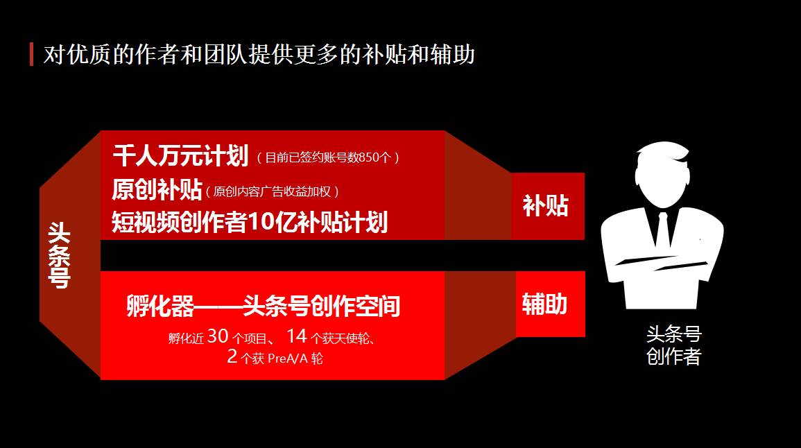 同时平台也在加强对原创内容的补贴,我们有个非常好的技术可以识别原创,另外今年头条号大会,我们又提出了对短视频创作者的10亿补贴计划。我们还做了一个孵化器,就在我们公司旁边,一个非常不错的办公环境,我们提供培训、投资的对接,财务法务等等方面的支持,目前已经孵化了30个项目,14个天使轮、2个获得pre-A或A轮投资。