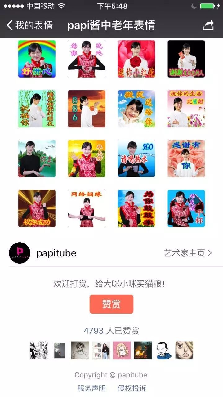 截止11月8日下午6点,papi酱中老年表情包共获4793人赞赏。