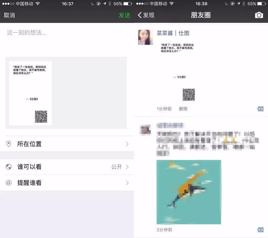 在朋友圈看到,如果不点开,根本看不清字。而如果要点开的话,所用的流量就是一张图的流量,还要消耗等待加载的时间。问题就来了:和真正的图片相比,它的信息量不够且不美。而对于纯文字来说,他要花更多的时间和耐心去理解同样的内容。如果要用这种方式去推广,实际上是一个吃力不讨好的行为。