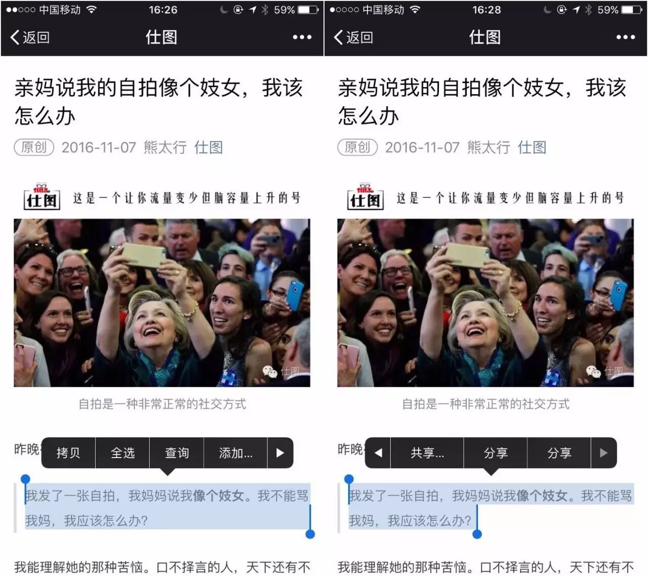 1. 你在某公号文章里看到一段非常有共鸣的话,想分享到朋友圈。首先你需要长按选中这段话。