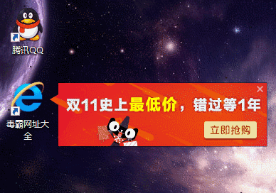 除了极具爆点的5波营销攻势,天猫“双11”的其他渠道营销也做得非常到位,除了巧妙利用自家资源将淘宝、支付宝等应用logo换成“双11”特别版以外,还做了很多大范围的高效率的线上广告,例如桌面弹窗、浏览器导航、百度的动态弹窗广告等。