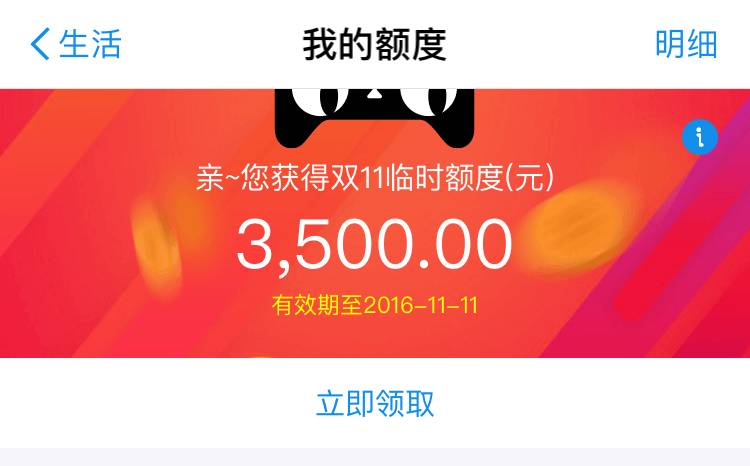 最后的友情提醒,支付宝已经悄悄升级了蚂蚁花呗的“双11”临时额度,多给3500元。钱不够,我们也能给天猫“双11”跪着唱《征服》了。