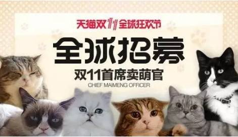 天猫会在全球范围内甄选一只猫,担任“双11”的CMO——首席卖萌官,据悉,目前已经有不少的“网红猫”争相竞投这个职位,当中不乏猫界的明星大咖,包括好莱坞明星的座上宾、身价上亿的不爽猫Grumpy;天生拥有优雅贵族气质,喜欢“思考”的法国哲学猫Henri;来自英国的孪生猫Milk 和Oreo,还有爱钻盒子的日本猫 Maru 等。