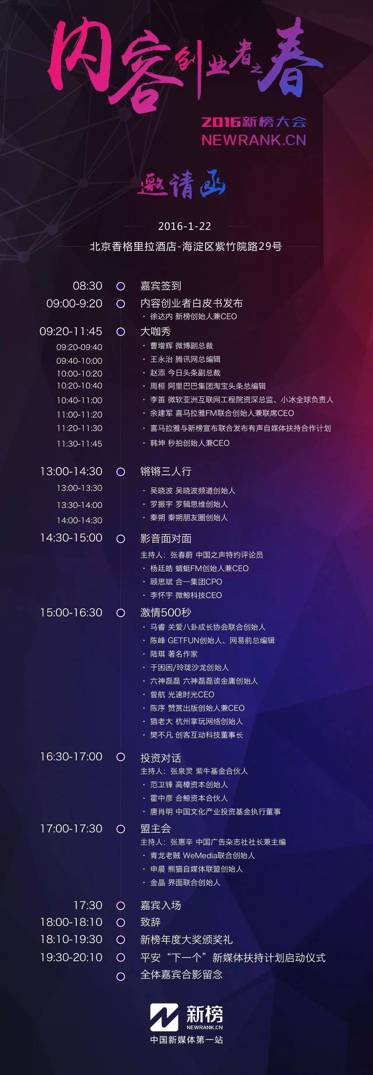 在2016年1月22日的“内容创业者之春·新榜大会”上,腾讯、微博、今日头条、喜马拉雅等平台方高层轮流上台,分享了他们对于未来一年的看法,陆琪、关八会长、六神磊磊、猫老大等自媒体代表也在现场描绘他们对于事业前景的期待。