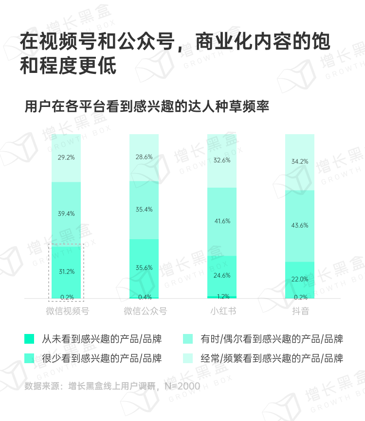 但微信生态的商业能力仍未被完全挖掘。“增长黑盒”研究报告显示,超过30%的视频号和公众号用户还未看到自己感兴趣的品牌广告,高于其他社交媒体比例。