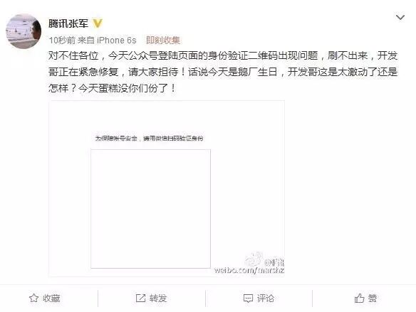 新榜讯 11月11日上午,大量公号主反映,在登陆微信公众号后台时,验证的二维码无法显示,导致无法进入微信公众号后台。对此,@腾讯张军 在微博回应:开发哥正在紧急修复。截止上午11点左右,该问题已全面修复。现在已经能够正常登陆。