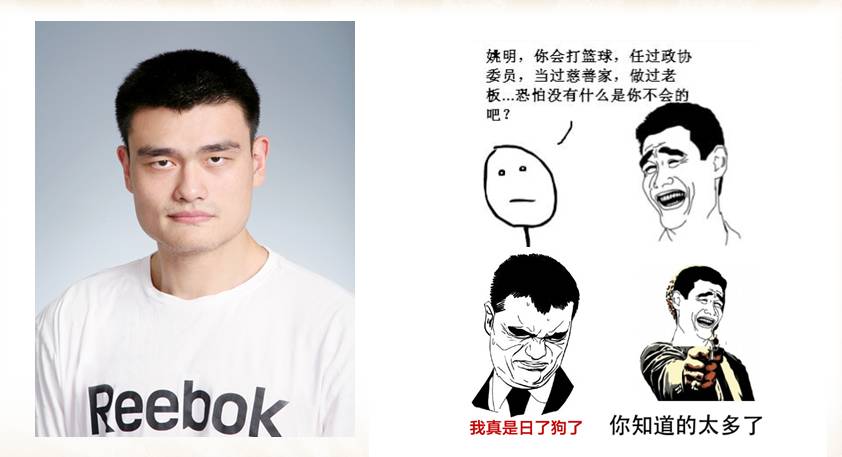 姚明大家可能会觉得长得很有个性,他现在网上是这样子的,这件事情放在5年前或者7年前那你们是摊上大事了,因为之前陈凯歌导演的《无极》被胡歌用”一个馒头的血案”调侃了,然后打了一通官司。在今天很难想象的是,我们有一个新的东西,巴不得有人去炒作,没人炒作,我们也要自己去炒作。