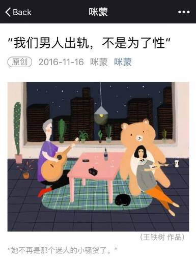 新榜讯 11月16日晚,“咪蒙”发出推文《“我们男人出轨,不是为了性”》,据咪蒙称,截至17日下午6点,阅读量已达239万,相比以往的常规推送,阅读量增加了100多万。