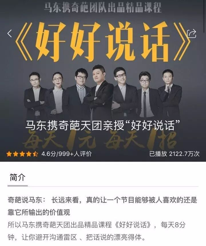 牟頔向新榜透露,米未传媒会继续深耕视频综艺这个品类,视频内容是核心和重点,但不会是全部。踩在内容创业和知识付费的风口上,米未传媒旗下新品牌“米果文化”推出了在线付费音频课程《好好说话》,也成为一个现象级产品。牟頔告诉新榜,截至目前,《好好说话》在喜马拉雅FM上已有10万付费用户,销售额约2000万,播放总量也已超过2000万。