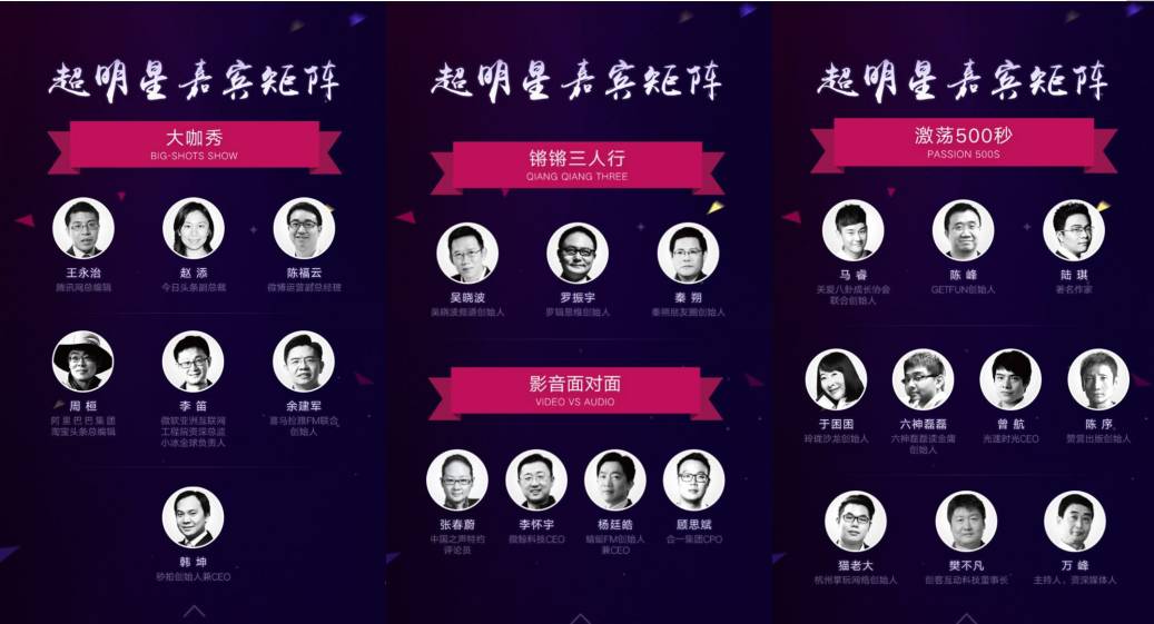 今年1月22日,腾讯网、今日头条、微博、阿里巴巴、喜马拉雅FM、一下科技等国内主要内容平台的管理高层聚集现场,而他们手中掌握着中国内容的大部分流量。吴晓波、罗振宇、秦朔等内容创业的最强代表同时上台,六神磊磊、关八会长、陆琪等一线自媒体人轮番上场,呈现出国内内容行业的完整生态。