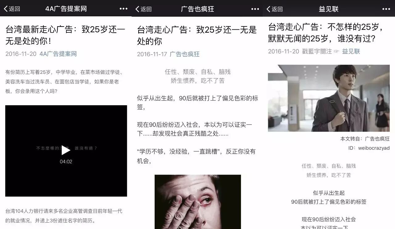 在发布该广告视频相关文章时,自媒体们都用了相对情怀的标题,例如《台湾走心广告:致25岁还一无是处的你》、《不怎样的25岁,默默无闻的25岁,谁没有过》、《谁给25岁的李安一个机会》……很明显,104基金会的广告营销目的似乎达到了一大半。