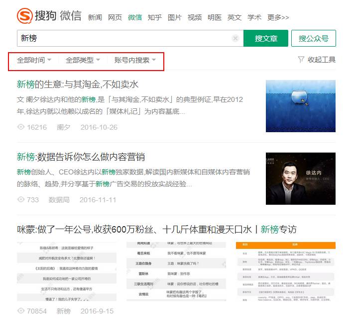 新榜讯 11月24日,不少用户发现搜狗微信搜索功能升级了。相比较之前,在对某一微信账号或者文章进行搜索后,新增了时间选择,文章类型选择,和账号内搜索的功能。用户直呼“使用起来更方便了!”