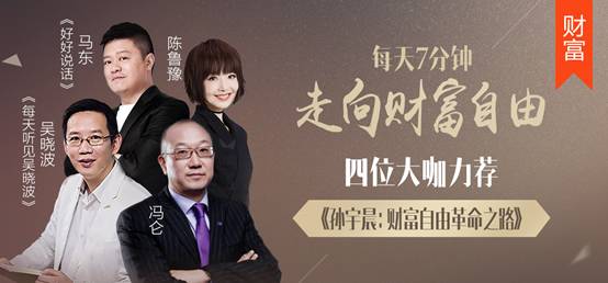 作为后起之秀,《财富自由革命之路》在喜马拉雅FM上的蹿红,离不开几位大咖的亲自推荐。其中包括孙宇晨称为“师长”的冯仑、鲁豫、马东、吴晓波,还有作为好友及创业伙伴的自媒体人同道大叔。