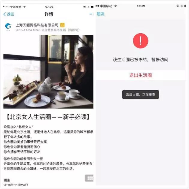 自上线之日起,支付宝的“圈子”就争议不断。今日,网友发现此前加入的“北京女人生活圈”被冻结,无法访问。新浪科技在支付宝首页搜索相关关键词,也无匹配内容。对此,支付宝回应称因为产品整体是在灰度测试中,部分圈子在做一些调试,后续会逐渐恢复。