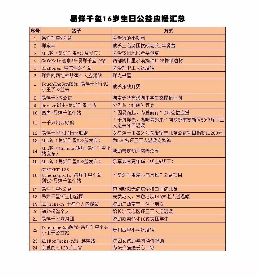 这次的应援策划有一个别样的亮点,粉丝们为易烊千玺策划了24个公益应援项目。
