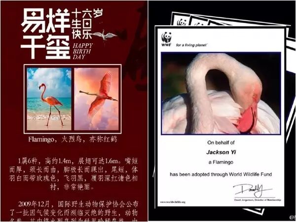 有粉丝们通过世界自然基金会(World Wide Fund for Nature or World Wildlife Fund)以易烊千玺的名义领养了四只可爱的火烈鸟,拯救濒危动物;在中国西部,为了改善西部日益严重的沙化问题,粉丝们发起“易烊千玺爱心林”活动,在中国西部沙漠种植1128棵树。
