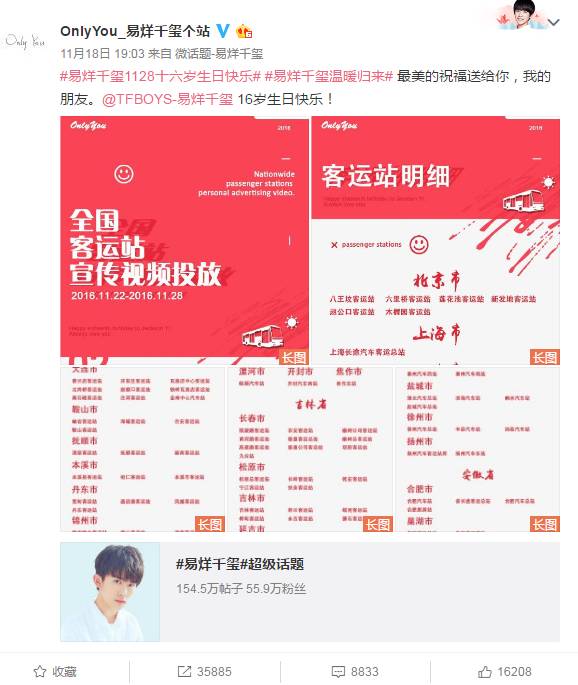 据悉,这个客运站视频应援由OnlyYou_易烊千玺个站策划,覆盖到17个省市583个客运站的5074块大屏,日客流量总和达到689万。在应援开始前,他们甚至在官方微博上发布了详情海报,海报制作很精致,文案很专业。