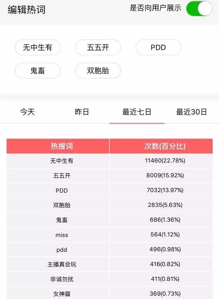 在主页点击热搜词模块后将进入热搜词的编辑页面。列表以今天、昨日、最近七日及最近30日四种时间维度展示了热门热搜词的统计结果。运营者能随时编辑热搜词,将“是否向用户展示”按钮调节至展示状态,词汇将立即出现在号内搜页面搜索框下方。