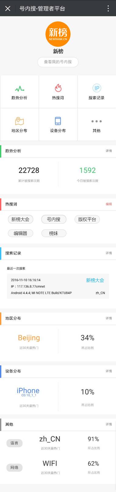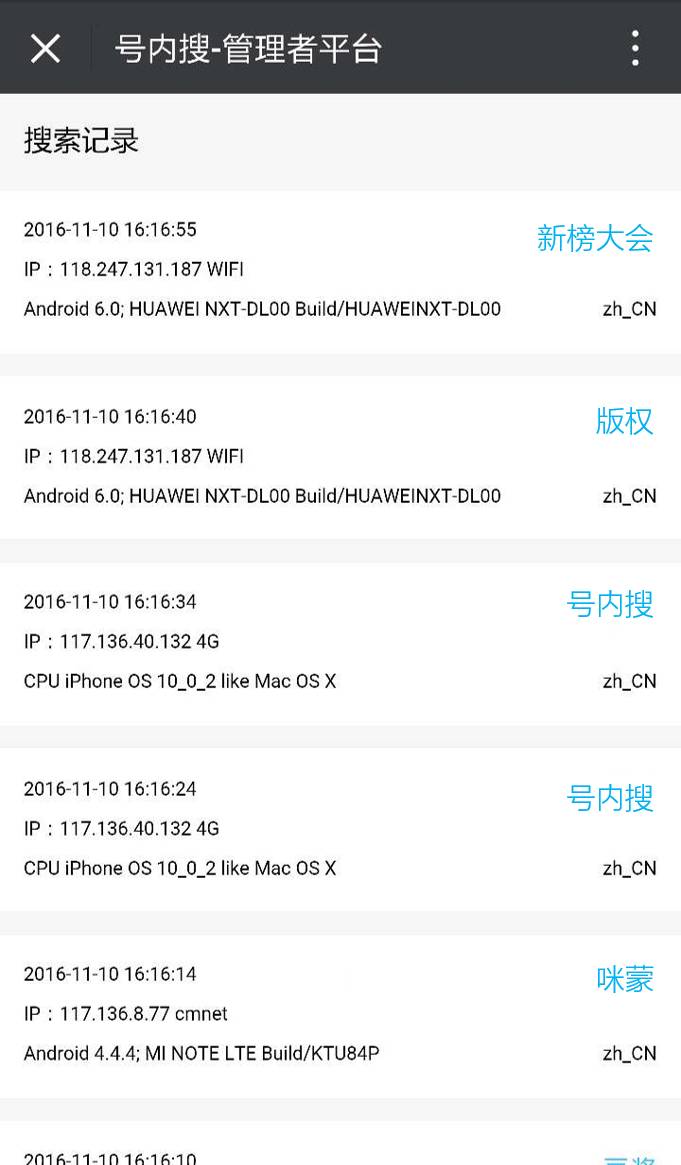 搜索记录:记录实时更新的用户搜索详情数据,每条搜索记录都记录了关键字、搜索时间、用户IP地址、网络环境、设备及系统语言,最多支持翻阅100条。