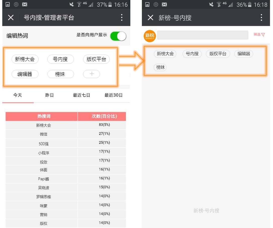 一是运营者能在号内搜页面推荐自定义的热搜词;