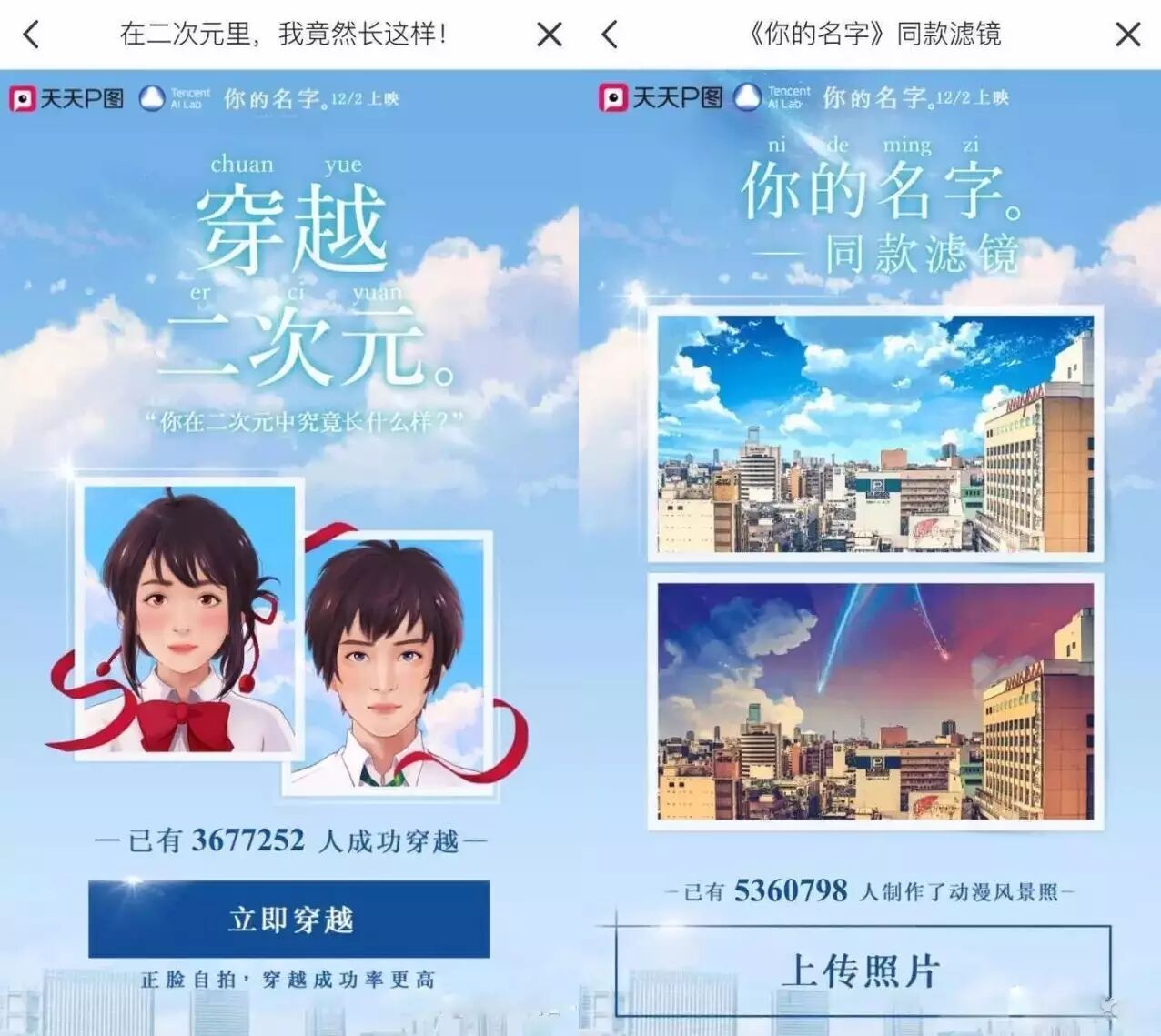 猫眼电影宣发团队的另一个利器就是创意营销,在《你的名字。》预售开启的同时,猫眼电影联合腾讯天天P图、QQ空间通过“同款滤镜”搞起了创意联动营销,用户只要上传自己的照片,就可以一键变成《你的名字。》风格。