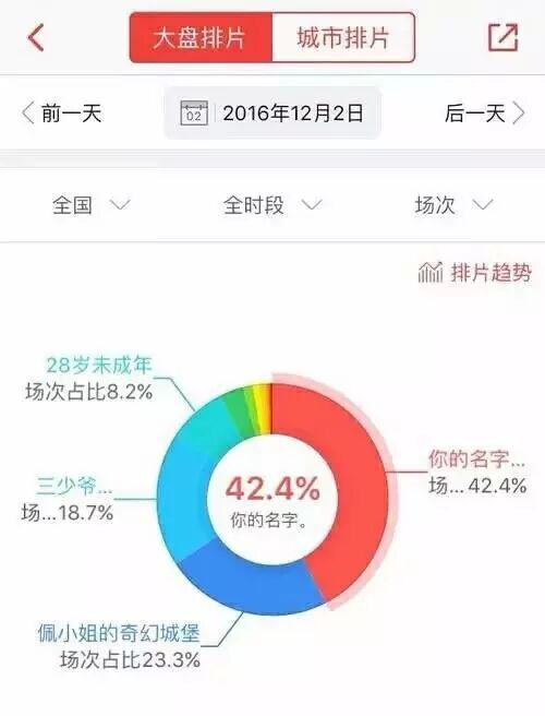 而从排片来看,发行方光线也出了不少力,《你的名字。》首日场次已超过6万场,是同期上映电影中最高的,甚至要高于光线今年力推的《大鱼海棠》首日4.36万场的排片。