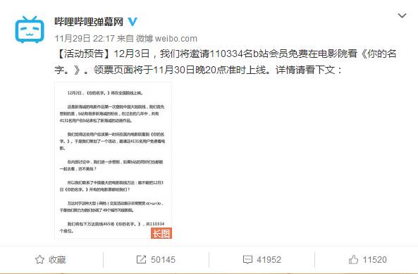 在《你的名字。》引进国内之前,二次元的好朋友B站已经买下了新海诚之前动漫作品的视频版权。11月29日晚,B站在微博上放了一个大招,他们要请4131名承包(承包相当于其他平台的打赏)过新海诚动漫作品的会员看《你的名字。》。