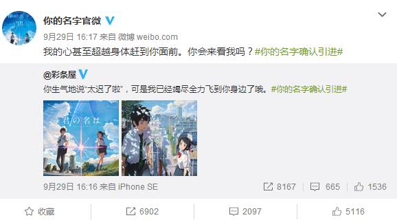 今年9月29日,光线旗下的彩条屋在官方微博宣布,正式引进《你的名字。》