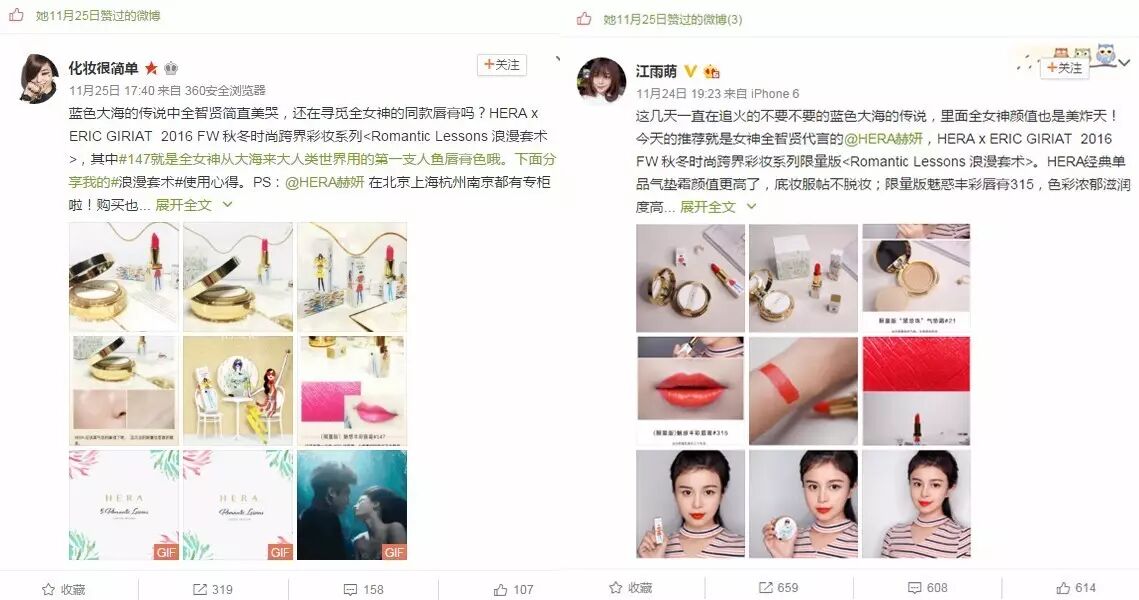 10月中下旬之后,《蓝色大海的传说》进入新剧宣传期,HERA赫妍的官方微博开始借势,活泛地宣传147号,转美妆博主@优里娜 的试色贴,点赞多位美妆博主的HERA赫妍147号使用贴。