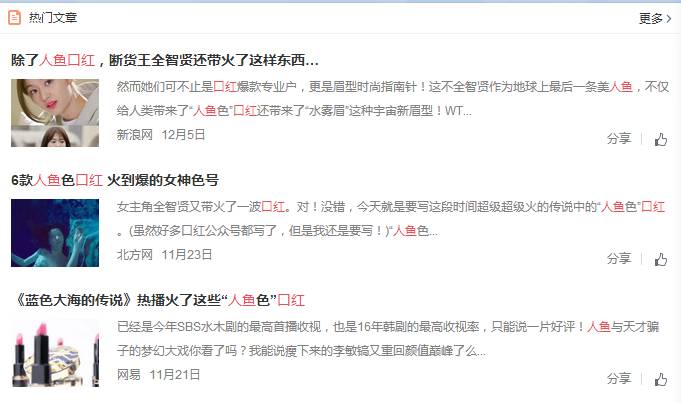 这几年,韩剧带火的口红中,最火的色号都有与电视剧直接联系的名字,例如人鱼色、星你色(《来自星星的你》同款口红),想你色(《想你》同款口红)。