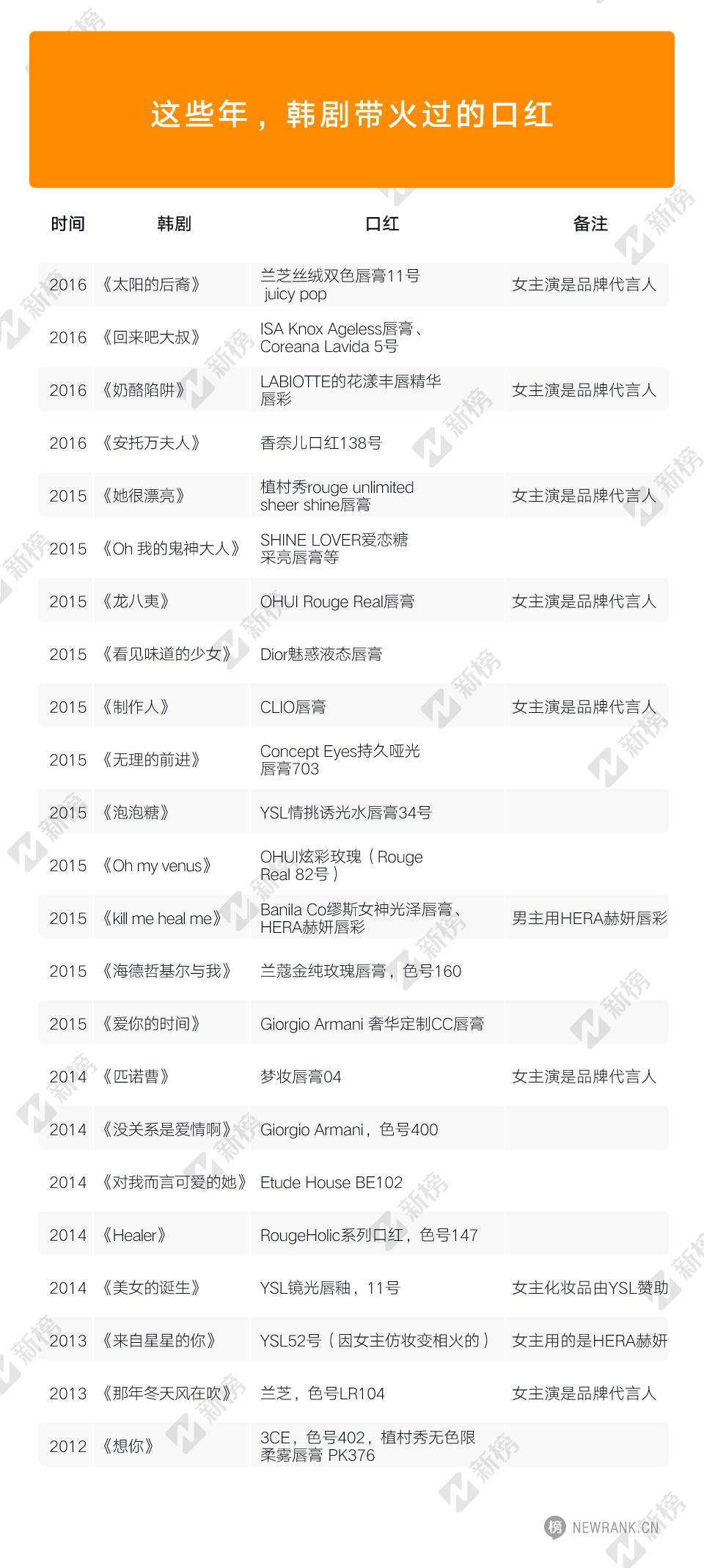 除了《蓝色大海的传说》,榜妹粗略统计了23部韩剧,发现还真是一部剧火一波口红。那化妆品品牌怎样才能借着热播剧的势头大火一把?