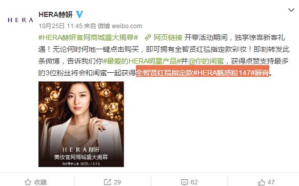 HERA赫妍十分看重147号的宣传,可以算是有“预谋”地在推动营销。在今年10月《蓝色大海的传说》播出前,HERA赫妍就为147号做了一些宣传铺垫,当时的口径是“全智贤红毯指定款”。