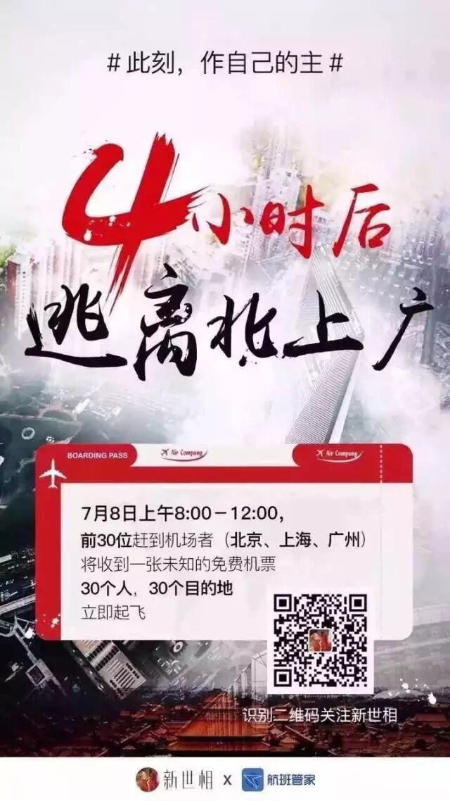 7月8日上午,“新世相”发出活动“4小时逃离北上广”,称前30位赶到北上广三地机场者,会收到一张未知的免费机票,前往30个目的地。