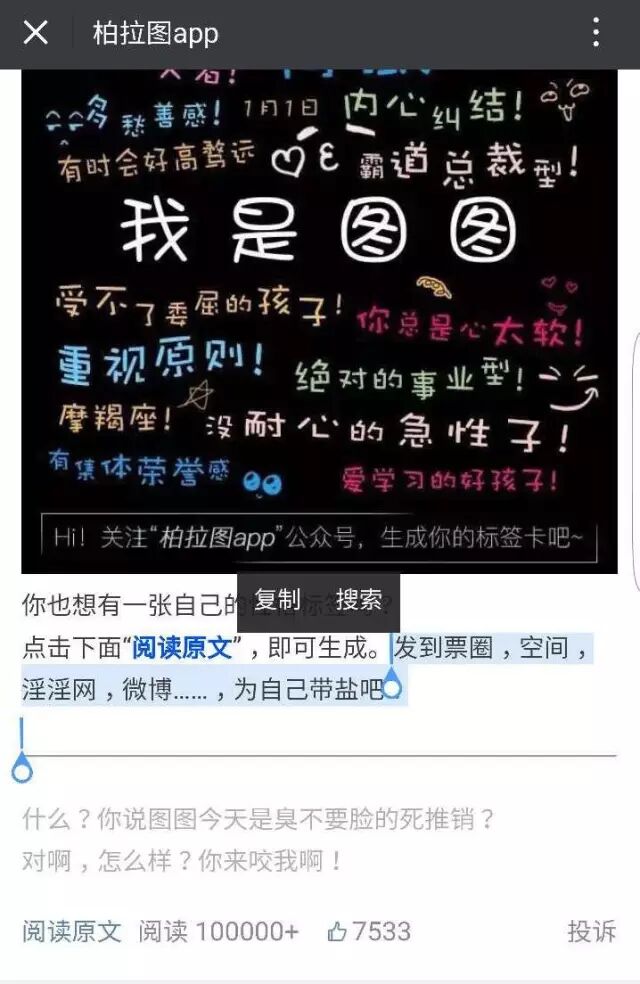 如果仅从数据上来说,不得不提的还有今年7月一上午涨粉百万的“柏拉图app”。通过“扫码关注生成标签”的形式,“柏拉图app”的性格测试小游戏在朋友圈疯狂刷屏,可能是由于瞬间使用人数过多,甚至一度导致这条制作链接出现乱码,无法正常进入。