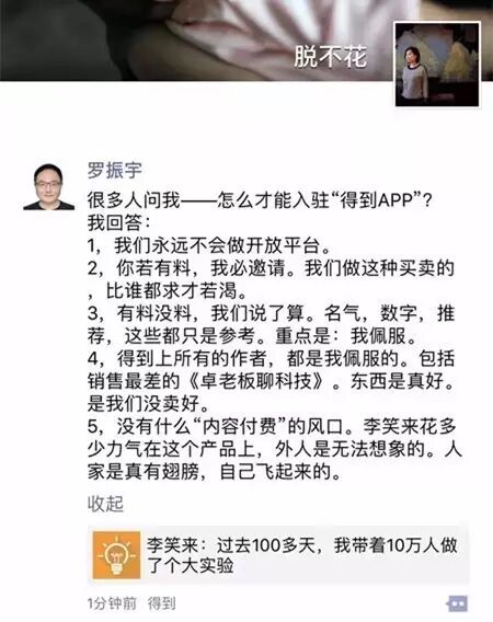 新榜讯 12月14日,罗振宇通过一条朋友圈状态对回应了很多人对如何入驻得到App的提问,并表示“我们永远不会做开放平台。你若有料,我必邀请。” 罗振宇在分享李笑来的内容时表述,没有什么“内容付费”的风口,人家是真的有翅膀,自己飞起来的。 以上内容使用新榜编辑器发布。新榜编辑器,多平台一键分发、海量在线图片搜索、大数据帮你了解“什么值得写”、丰富的样式中心,可能是全中国最好用的编辑器。 撕咪蒙 米未传媒 一个人听 馒头说 90后创业 评估创业 米未传媒 剽悍一只猫 青藤文化 电影工厂 丢书大作战 八卦之王 咪蒙竞选 吃喝玩乐 大字报