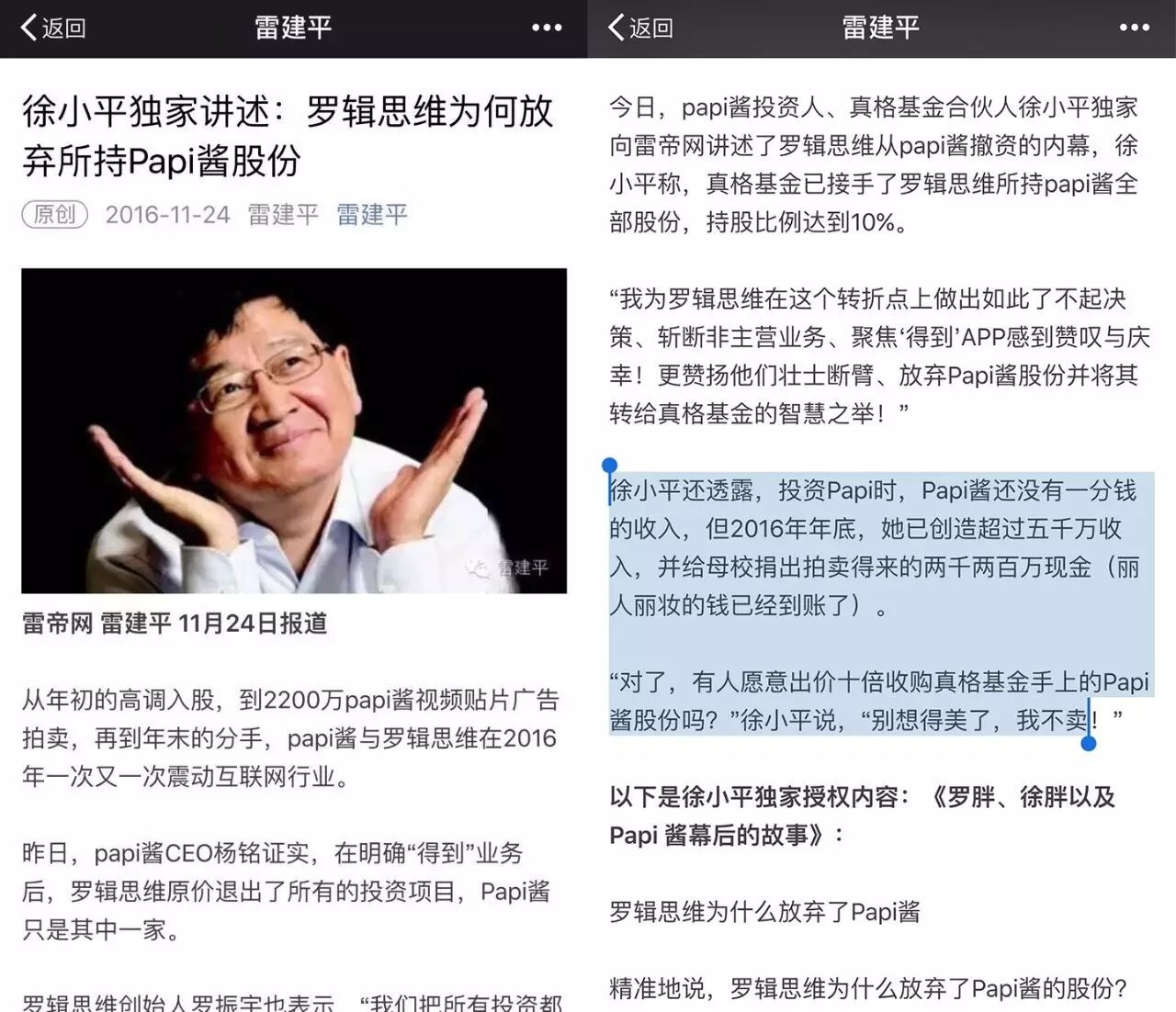 今年在papi酱与罗辑思维分手后,papi酱投资人、真格基金合伙人徐小平在接受雷帝网的采访时提到:“投资papi时,papi酱还没有一分钱的收入,但2016年年底,她已创造超过五千万收入,并给母校捐出拍卖得来的两千两百万现金(丽人丽妆的钱已到账了)。”