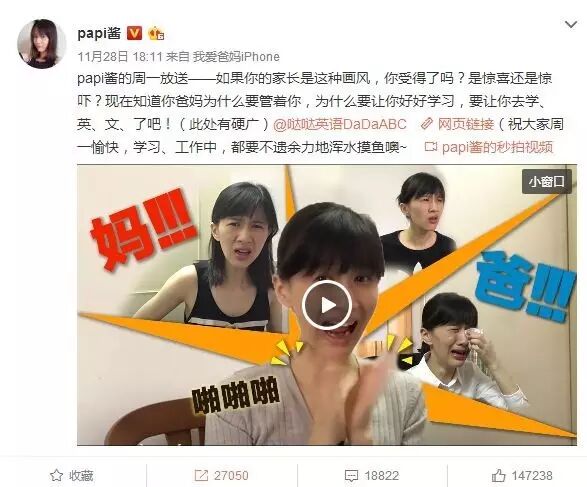在papi酱的广告中,哒哒英语无疑属于最直接最“真诚”的一个,开门见山直入主题。在视频《这样的妈,给我来一打》中,哒哒英语首次出镜,长达10秒的贴片广告,简单,直接。就连papi酱在对其推广的微博中都直接附上:此处有硬广。