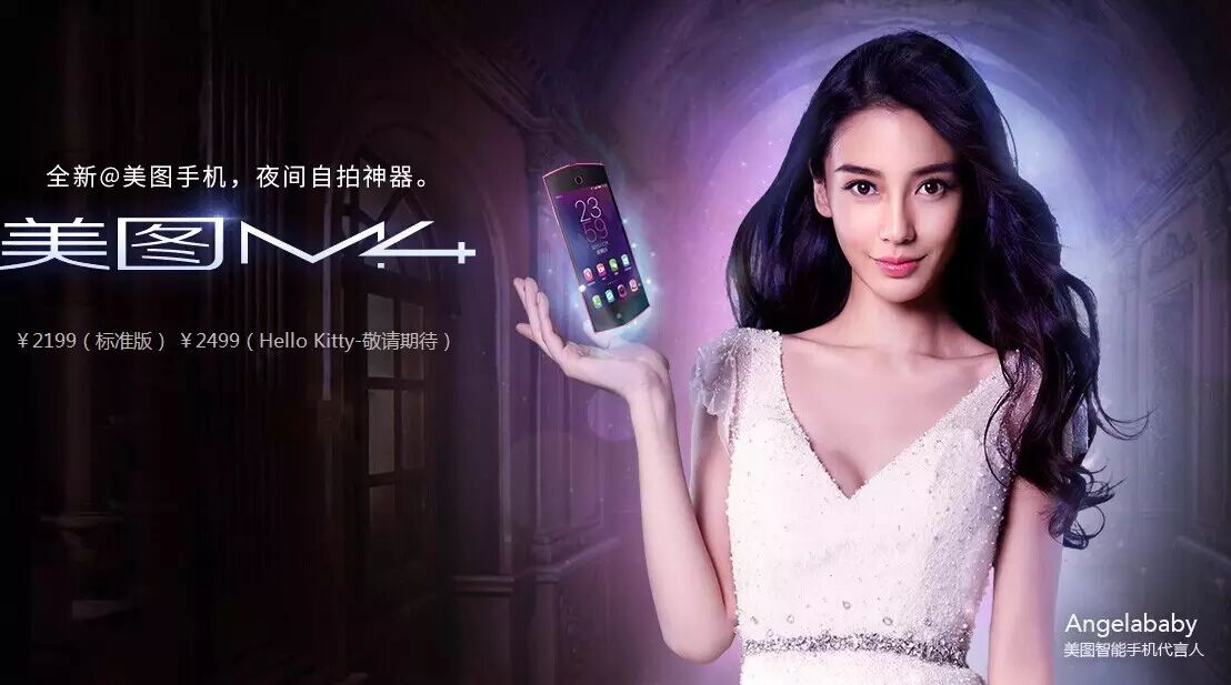 包括一些特别版,美图公司上市的拍照手机不多,仅9款。而这9款手机的代言人都是Angelababy。每逢新手机上市召开发布会,Angelababy都十分尽责站台撑场,例如,去年美图M4发布会时,Angelababy到现场助阵,美图公司赠予她唯一定制版的美图M4手机,配色与她的爱车相同。