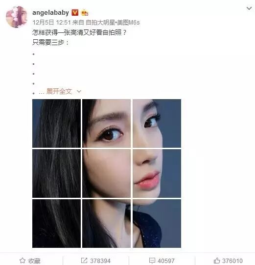 Angelababy算不上是网瘾少女,12月的15天,她只发了6条微博,但5条微博都发自美图M6s手机,微博小尾巴清楚标明是“自拍大明星•美图M6s”;12月5日发的微博还是M6s专属推广文案;最最最敬业的是,在转发黄晓明公布媳妇怀孕的热门微博时,Angelababy用的也是美图手机。