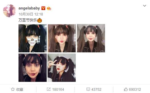 Angelababy古怪精灵,经常会在微博中晒出一些稀奇古怪的照片和视频,例如夏至日晒抽象派画风的冰箱,万圣节晒万圣妆P图,甚至还搞怪P出逆天长腿和喵星人妆。
