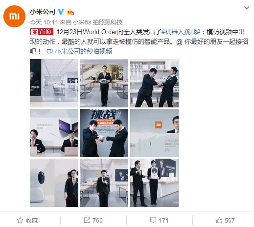 只发个一个视频,显然不是小米的作风。今天早上,还是10点左右,@小米公司 发布了一条九宫格,宣布正式向全人类发起“机器人挑战”:模仿视频中出现的动作,最酷的人就可以拿走被模仿的智能产品。单从数据来看,网友对机器人挑战活动的热情不如广告视频本身。