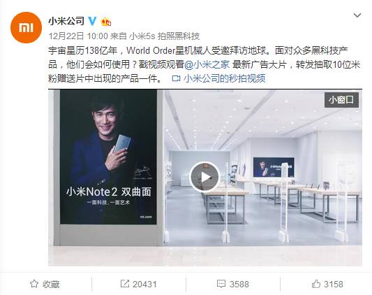 事情是这样的:昨天上午10点整,小米在旗下官方微博@小米公司 发布了一个2分34秒的视频广告。微博配发的文案还颇有意思,把时间设定在宇宙星历138亿年,渲染了一种外星人入侵地球的氛围。