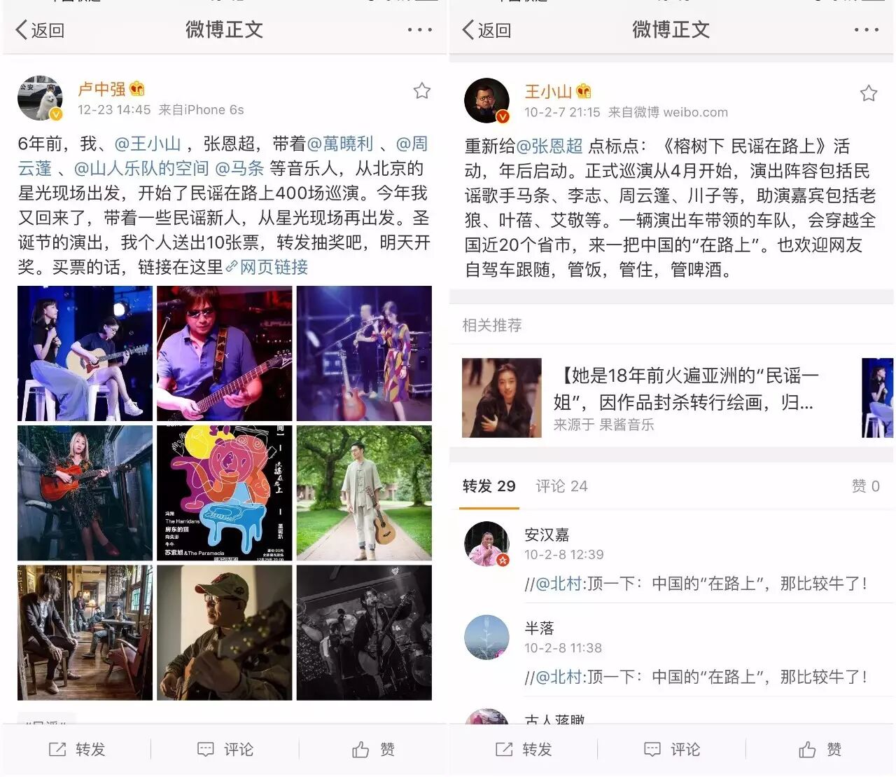 而“民谣在路上”的迅速起步,则要归于微博等社交媒体的爆发。卢中强回忆,当年最开始的演出就是靠王小山以及诸多南方系的人在微博力挺。一起创始“民谣在路上”的王小山当时已是微博大V,他的微博为他们带来成效显著的宣传,也造成“重大损失”。