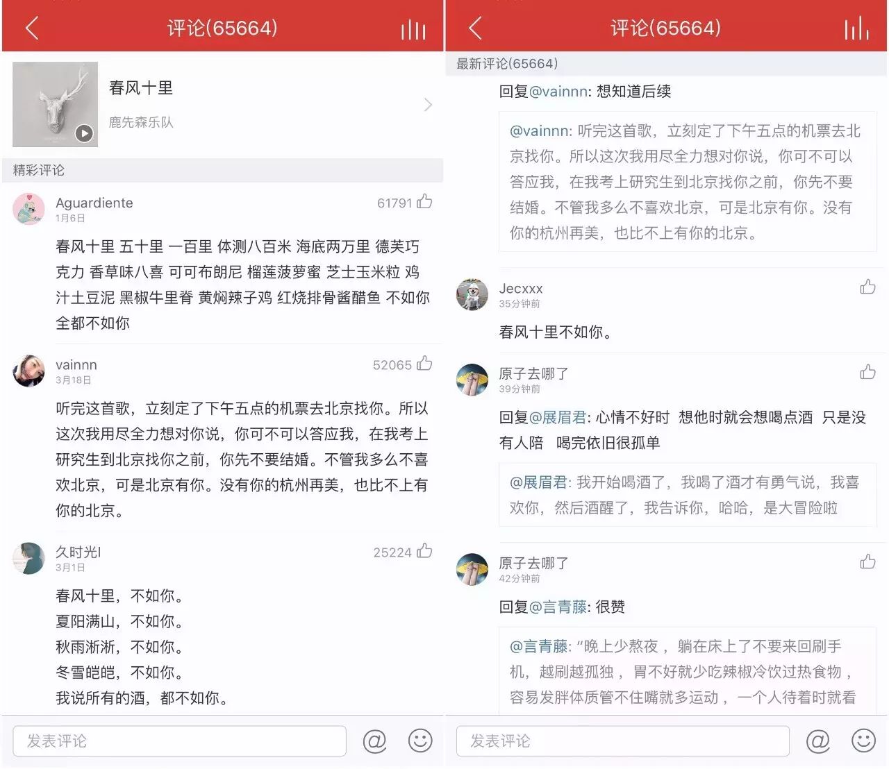 “我之前在上海看鹿先森乐队《春风十里》的演出,这首歌太火了,当时我把他们的数据从各个平台调了一下,量是惊人的,尤其李宇春翻唱之后,但缺一个好的视频,如果有的话这一定是个大爆款,而且这种大爆款其实蛮多的。”十三月创始人卢中强认为,一首歌火了之后,相对应的视频也就具备了传播的潜质,“网易云里《春风十里》排在最前的一些评论,都是特别好的故事,或者说IP,这些东西一定是需要短视频呈现的。”