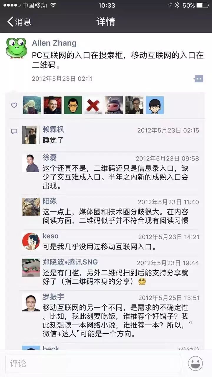 张小龙说:“在智能手机时代,我是认为我们要获取服务的话,更多的是跟线下有关,跟线下有关的服务其实目前手机技术的实现来说,可能通过扫二维码这样的一个方式是最简易的一种方式,跟周边产生一个联系,并且获取服务。”