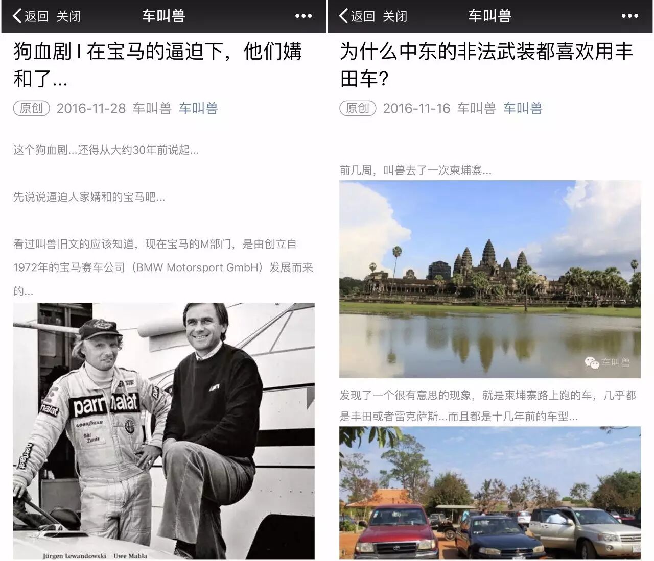 车叫兽由此预测,对于有一定用车购车经验的用户来说,传统媒体汽车资讯的价值会下降。为此,他注册了公众号“车叫兽”,以自己的喜好为样本推送内容,仅仅为了试验这个猜测是否正确,误打误撞做起了自媒体人。